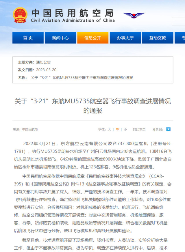 中國民航局發布《關於“3·21”東航MU5735航空器飛行事故調查進展情況的通報》