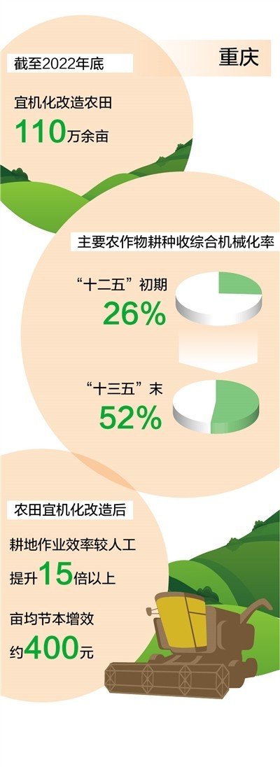 2015年起,重慶著眼於(yu) 提升農(nong) 業(ye) 機械化水平,探索推進丘陵山區農(nong) 田宜機化改造。截至2022年底,重慶已對110萬(wan) 餘(yu) 畝(mu) 農(nong) 田進行了宜機化改造,主要農(nong) 作物耕種收綜合機械化率由“十二五”初期的26%提高到“十三五”末的52%。