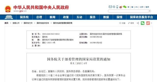央視網消息:3月20日,《國務院關(guan) 於(yu) 部委管理的國家局設置的通知》發布。具體(ti) 如下: