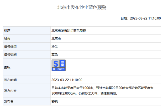 央視網消息:北京市氣象台2023年3月22日11時10分降級發布沙塵藍色預警信號:目前本市能見度已大於(yu) 1000米,預計當前至22日20時大部分地區能見度為(wei) 3000米至8000米,仍有沙塵天氣,請注意防範。