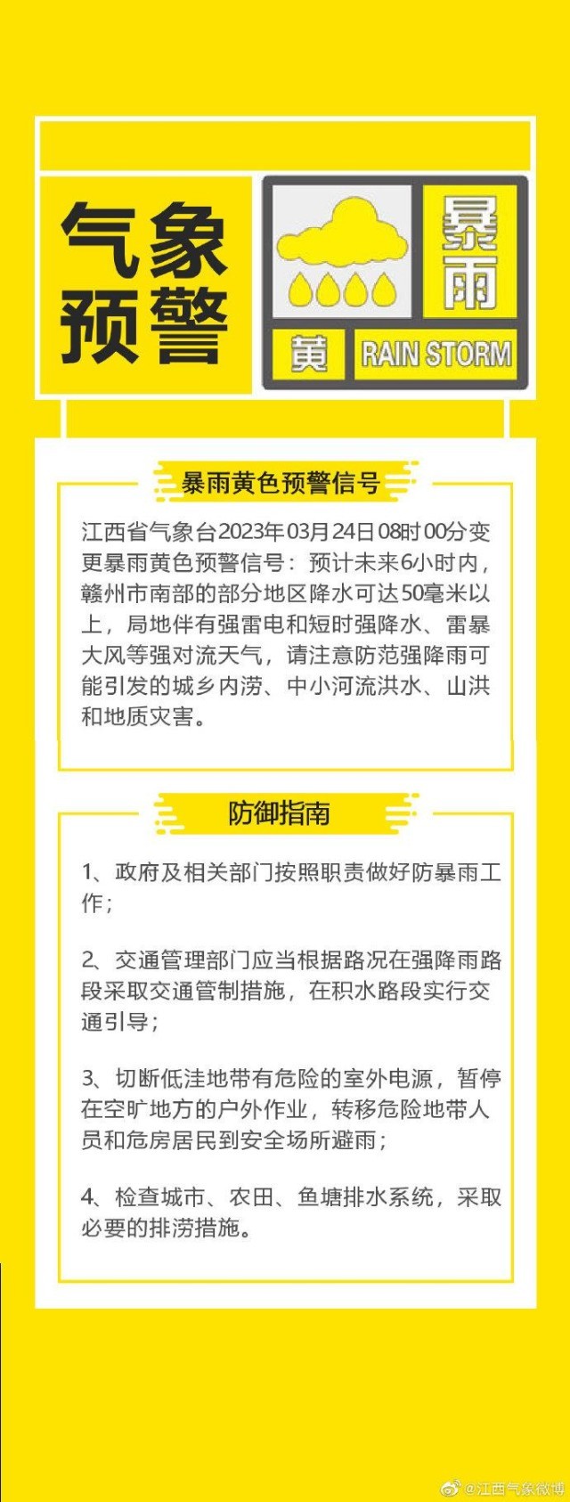 江西省氣象台2023年03月24日08時00分變更暴雨黃色預警信號:預計未來6小時內(nei) ,贛州市南部的部分地區降水可達50毫米以上,局地伴有強雷電和短時強降水、雷暴大風等強對流天氣,請注意防範強降雨可能引發的城鄉(xiang) 內(nei) 澇、中小河流洪水、山洪和地質災害。