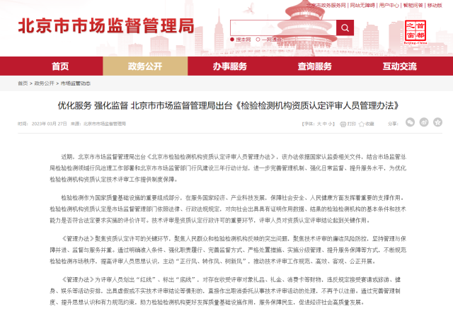 北京市市場監督管理局出台《檢驗檢測機構資質認定評審人員管理辦法》