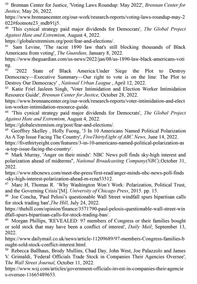 多重手法並用操弄選舉(ju) 結果。“許多美國人完全摒棄了平等的觀念,而常常正是由這些摒棄平等觀念的人製定他人不得不遵守的規則。”(注38)限製選民投票資格的法律頻繁出台。布倫(lun) 南司法中心2022年5月26日發表的研究指出,2021年美國有18個(ge) 州通過了34項限製投票的法律。在2022年的立法季,有39個(ge) 州的立法機關(guan) 審議了至少393項限製性法案,通過設置一係列投票障礙,極大地製約了有色人種選民行使投票權。亞(ya) 利桑那州頒布了規製選民登記中提供身份證明文件的法律,多達20萬(wan) 名選民可能麵臨(lin) 被取消登記的風險。(注39)“全球反對仇恨和極端主義(yi) 組織”2022年8月4日發表題為(wei) 《美國人的恐懼感抑製民主參與(yu) 》的報告指出,40%的非洲裔和37%的拉美裔美國人擔心被剝奪投票權利。(注40)英國《衛報》網站2022年1月8日發表題為(wei) 《1890年的種族主義(yi) 法律仍在阻止成千上萬(wan) 的美國黑人投票》的文章指出,嚴(yan) 苛的投票資格法律阻止了密西西比州近16%適齡投票的非洲裔美國人進行投票。該州作為(wei) 非洲裔最集中的地區之一,一個(ge) 多世紀以來從(cong) 未選舉(ju) 出一名非洲裔擔任公職。(注41)“美國城市聯盟”2022年4月12日發布《2022年非洲裔美國人狀況報告:摧毀民主的陰謀籠罩之下》指出,過去一年,有20個(ge) 州利用人口普查數據重新劃分選區,剝奪了非洲裔等大量少數族裔選民的投票權。(注42)這些操縱選舉(ju) 的手段變相剝奪了大量選民的投票資格,平等的選舉(ju) 權名存實亡。
