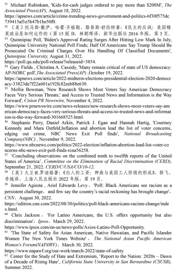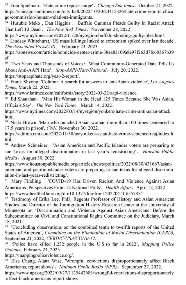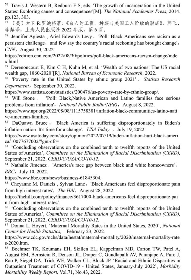 聯合國消除種族歧視委員會(hui) 2022年9月21日發布的關(guan) 於(yu) 審議美國履行《消除一切形式種族歧視國際公約》情況的結論性報告指出,美國曆史上殖民主義(yi) 和奴隸製留下的陰影至今仍揮之不去,助長著美國社會(hui) 流行的種族主義(yi) 。近幾年來,美國仇恨犯罪和仇恨言論事件顯著增加,與(yu) 種族有關(guan) 的槍支死傷(shang) 人數大幅增加,有色人種和少數族裔在醫療、教育、住房等領域持續麵臨(lin) 係統性歧視。(注57)