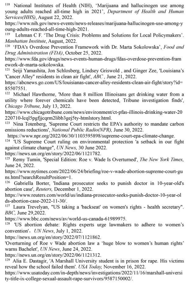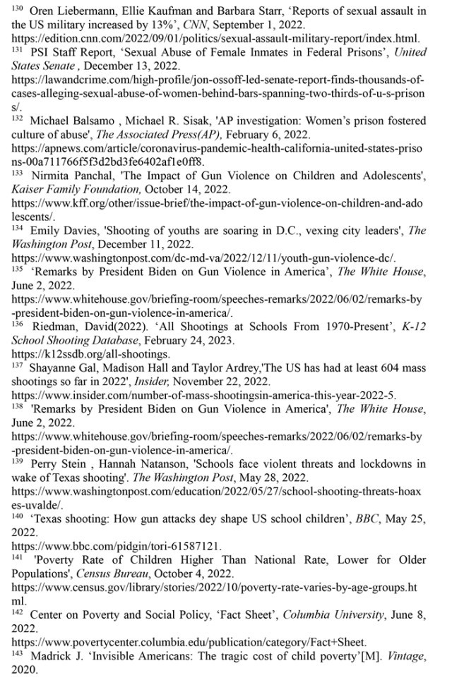 婦女墮胎失去憲法保護,兒(er) 童生存環境令人擔憂。美國聯邦最高法院推翻“羅伊訴韋德案”的裁決(jue) 終結了近50年來受憲法保護的墮胎權,是對婦女人權和性別平等的巨大打擊。2022年美國有超過5800名18歲以下的兒(er) 童因槍擊受傷(shang) 或死亡,校園槍擊事件數量高達302起,創1970年以來的最高值。美國兒(er) 童貧困率從(cong) 2021年12月的12.1%上升至2022年5月的16.6%,增加了330萬(wan) 貧困兒(er) 童。2018年以來被非法雇用的童工激增近70%,2022財年受雇專(zhuan) 門從(cong) 事危險工作的兒(er) 童增加了26%。