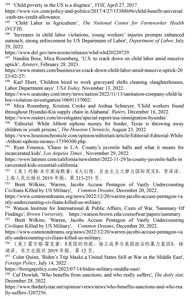 非法使用童工現象屢禁不止。根據非盈利組織“美國農(nong) 場工人健康中心”的數據,美國有30萬(wan) 至80萬(wan) 名未成年人在農(nong) 場工作。(注145)美國《石板》網絡雜誌指出,美國很多快餐店違反保護兒(er) 童健康與(yu) 教育的規定,雇用青少年超時工作。童工問題屢禁不止,根源是美國法律體(ti) 係存在漏洞。受新冠疫情和供應鏈危機影響,美國多地出現“用工荒”現象,多州批準新法案延長未成年人工作時間。根據美國勞工部的數據,2022年,美國有數百萬(wan) 青少年受雇在農(nong) 業(ye) 、食品服務、零售、娛樂(le) 和建築行業(ye) 工作。(注146)路透社2023年2月28日報道,美國非法雇傭(yong) 童工問題日益嚴(yan) 重,自2018年以來,被非法雇用的童工激增了近70%。根據美國勞工部的數據,2022財年有835家企業(ye) 違法雇用3800名兒(er) 童,受雇專(zhuan) 門從(cong) 事危險工作的兒(er) 童增加了26%。(注147)《今日美國報》2022年11月13日報道,威斯康星州帕克斯清潔服務公司雇用了30多名13至17歲的未成年人在肉類加工廠和農(nong) 場擔任清潔工。幾名未成年雇員在工作中受傷(shang) ,其中一名13歲兒(er) 童被腐蝕性清潔化學品燒傷(shang) 。(注148)路透社2022年12月16日報道,在阿拉巴馬州至少有四家汽車零部件供應商被發現雇傭(yong) 童工,勞務派遣機構將未成年人移民安置在工廠工作。(注149)時至今日,美國仍是聯合國193個(ge) 會(hui) 員國中唯一沒有批準《兒(er) 童權利公約》的國家,解決(jue) 雇傭(yong) 童工問題的前景依然黯淡。