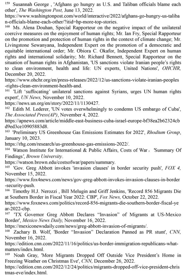 長期肆意實施單邊製裁。近年來,美國對其他國家實施的單邊製裁呈指數級增長,極大削弱了被製裁國家人權保障的能力與(yu) 水平。孟加拉國《每日星報》2022年12月28日報道,美國實施的單邊製裁總數為(wei) 世界之最,目前仍在對20多個(ge) 國家實施製裁,包括1962年以來對古巴的製裁、1979年以來對伊朗的製裁、2011年以來對敘利亞(ya) 的製裁,以及近年來對阿富汗的製裁,導致被製裁國家無法向其人民提供基本的食物和藥品。(注158)《華盛頓郵報》2022年6月13日報道,近一半的阿富汗人沒有足夠的食物,兒(er) 童營養(yang) 不良呈上升趨勢。(注159)2022年12月20日,多名聯合國人權理事會(hui) 獨立專(zhuan) 家發表共同聲明指出,美國政府對伊朗的製裁加劇了伊朗的環境危害,使所有在伊朗的民眾(zhong) 無法充分享受健康權和生命權,侵犯了伊朗人民享有清潔環境的權利。(注160)聯合國單邊強製措施對人權負麵影響問題特別報告員阿萊娜·杜晗2022年11月10日指出,單邊製裁加劇了敘利亞(ya) 人民的苦難,是對人權的嚴(yan) 重侵犯。(注161)美國政府肆意實施製裁引發他國人權危機受到國際社會(hui) 強烈譴責。2022年11月3日,聯合國大會(hui) 就敦促美國終止對古巴的經濟、商業(ye) 和金融封鎖進行投票表決(jue) 。在193個(ge) 成員國中,多達185個(ge) 國家支持譴責美國對古巴的禁運。(注162)這是聯合國大會(hui) 連續30次通過類似決(jue) 議。