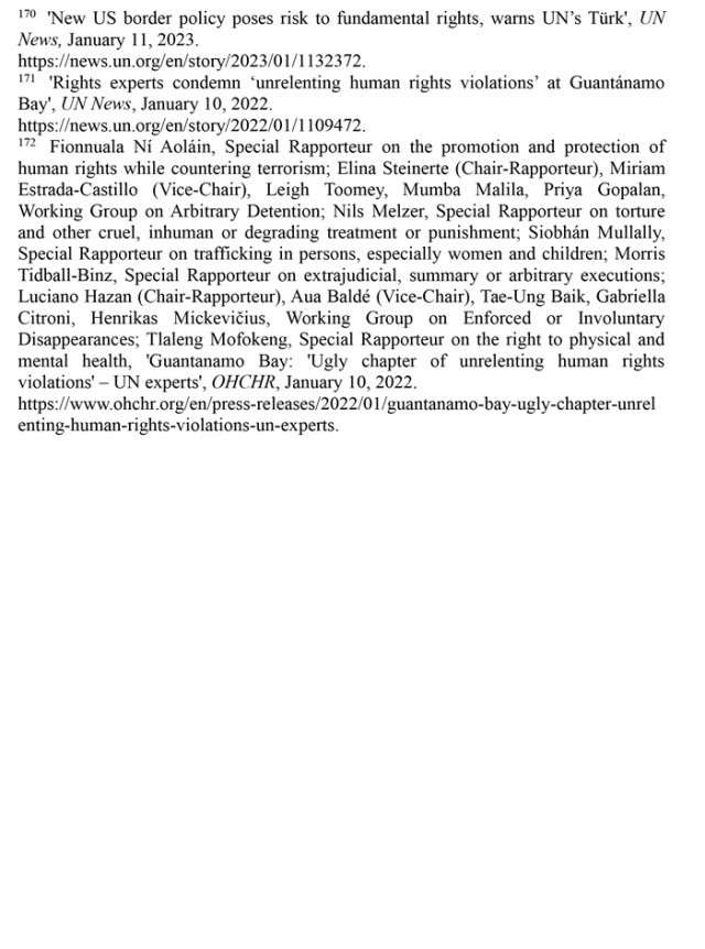 拒不關(guan) 閉關(guan) 塔那摩監獄。2002年設立的關(guan) 塔那摩監獄最多時曾關(guan) 押約780人,其中大多數人未經審判便遭拘留,受到了殘忍的、不人道的待遇,是美國“肆意侵犯人權的一個(ge) 醜(chou) 陋篇章”。(注171)聯合國人權理事會(hui) 在反恐中促進和保障人權問題特別報告員菲奧努阿拉·尼奧萊因等多名獨立專(zhuan) 家2022年1月發表共同聲明指出,臭名昭著的關(guan) 塔那摩監獄是美國在人權保護上的汙點,要求美國政府關(guan) 閉關(guan) 塔那摩監獄,對遭受酷刑、任意拘留的公民進行賠償(chang) ,並根據國際法追究授權和實施酷刑的人員的責任。(注172)