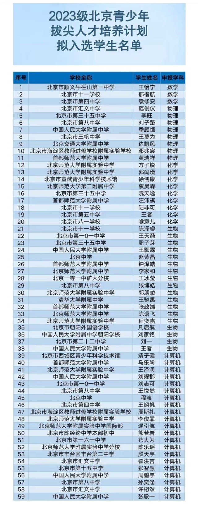 59名中學生擬入選“北京青少年拔尖人才培養計劃”