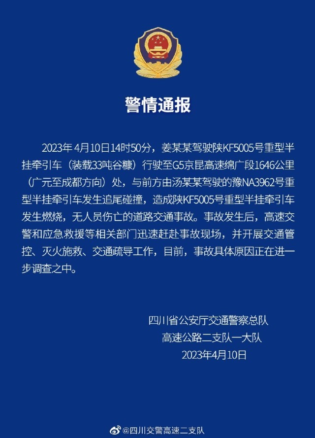 央視網消息:據@四川交警高速二支隊微博通報,4月10日14時50分,薑某某駕駛陝KF5005號重型半掛牽引車(裝載33噸穀糠)行駛至G5京昆高速綿廣段1646公裏(廣元至成都方向)處,與(yu) 前方由湯某某駕駛的豫NA3962號重型半掛牽引車發生追尾碰撞,造成陝KF5005號重型半掛牽引車發生燃燒,無人員傷(shang) 亡的道路交通事故。事故發生後,高速交警和應急救援等相關(guan) 部門迅速趕赴事故現場,並開展交通管控、滅火施救、交通疏導工作,目前,事故具體(ti) 原因正在進一步調查之中。