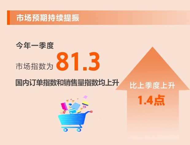 今年以來經濟循環加快暢通,市場需求逐步恢複,消費勢頭有所好轉,市場預期明顯恢複。一季度,市場指數為(wei) 81.3,環比上升1.4點。所調查的8個(ge) 行業(ye) 中,國內(nei) 訂單指數和銷售量指數均上升,7個(ge) 行業(ye) 銷售價(jia) 格指數上升。