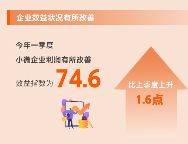 企業(ye) 生產(chan) 經營加速恢複,原材料價(jia) 格漲幅收窄,以及延續優(you) 化減稅降費政策減輕企業(ye) 負擔,小微企業(ye) 利潤有所改善。一季度,效益指數為(wei) 74.6,比上季度上升1.6點,反彈幅度較大,但仍處於(yu) 曆史較低位。所調查的8個(ge) 行業(ye) 效益指數均有所上升。