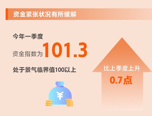 央行降準以及指導金融機構繼續支持小微企業(ye) ,多措並舉(ju) “精準滴灌”,小微企業(ye) 融資狀況不斷改善。一季度,資金指數為(wei) 101.3,比上季度上升0.7點,處於(yu) 景氣臨(lin) 界值100以上。其中,流動資金指數為(wei) 86.3,比上季度上升1.1點;融資指數為(wei) 90.8,環比上升0.5點。所調查的8個(ge) 行業(ye) 中,8個(ge) 行業(ye) 流動資金指數、6個(ge) 行業(ye) 融資指數均上升。