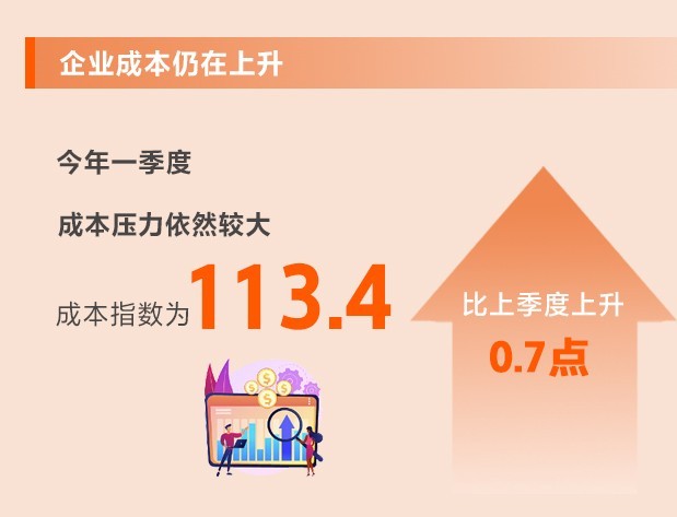 全球通脹仍處於(yu) 高位,美聯儲(chu) 急速加息對世界經濟影響的外溢效應持續顯現。中小企業(ye) 多位於(yu) 產(chan) 業(ye) 鏈下遊且麵對消費者,需求疲弱情況下難以轉嫁上遊原材料價(jia) 格上漲的壓力,同時還麵臨(lin) 人力成本上行以及房屋租金較高等困難。一季度,成本指數為(wei) 113.4,比上季度上升0.7點,仍處於(yu) 不景氣區間,說明成本壓力依然較大。所調查的8個(ge) 行業(ye) 中,7個(ge) 行業(ye) 生產(chan) 成本指數、8個(ge) 行業(ye) 勞動力成本指數均上升。