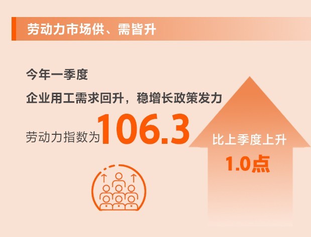 隨著生產(chan) 生活秩序的恢複,人員流動性的提高,企業(ye) 用工需求開始回升,同時穩增長政策持續發力,從(cong) 業(ye) 人數有所上升。一季度,勞動力指數為(wei) 106.3,比上季度上升1.0點。其中,供應指數為(wei) 113.6,比上季度上升0.1點;需求指數為(wei) 98.9,比上季度上升1.9點。