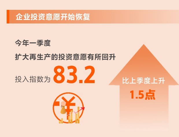 各地投向基礎領域、短板領域、科技創新領域的項目和計劃增多,企業(ye) 對未來的信心有所增強,擴大再生產(chan) 的投資意願有所回升。一季度,投入指數為(wei) 83.2,比上季度上升1.5點,所調查的8個(ge) 行業(ye) 投入指數均上升。