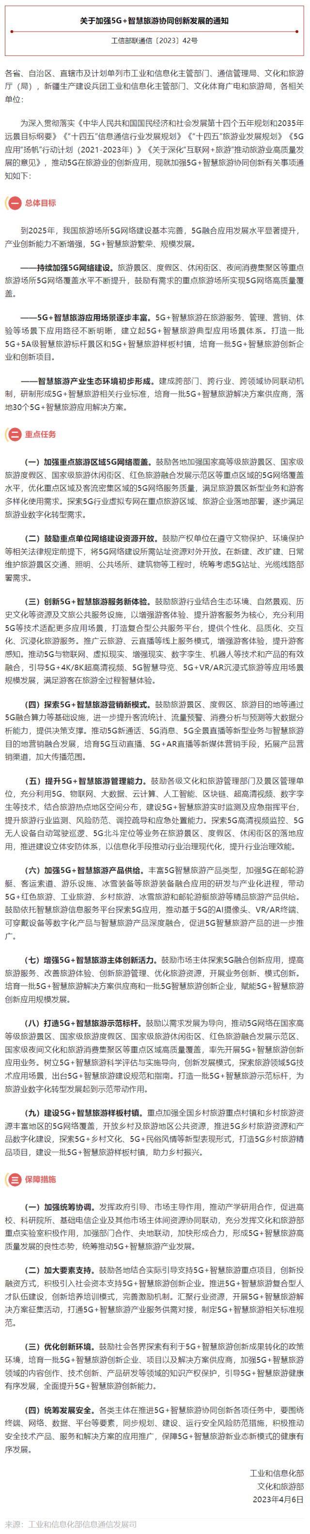 據“工信微報”公眾(zhong) 號消息,為(wei) 深入推進5G在旅遊業(ye) 的創新應用,賦能旅遊業(ye) 數字化、網絡化、智能化轉型升級,培育發展智慧旅遊新業(ye) 態、新模式,推動5G智慧旅遊協同創新發展,工業(ye) 和信息化部聯合文化和旅遊部印發《關(guan) 於(yu) 加強5G+智慧旅遊協同創新發展的通知》。