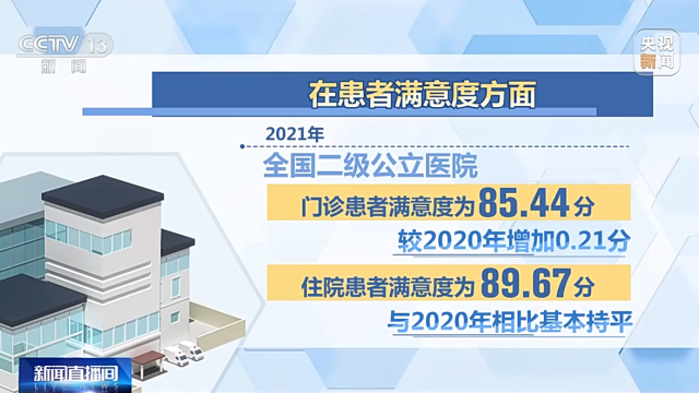 在患者滿意度方麵,2021年,全國二級公立醫院門診患者滿意度為(wei) 85.44分,較2020年增加0.21分,住院患者滿意度為(wei) 89.67分,與(yu) 2020年相比基本持平。