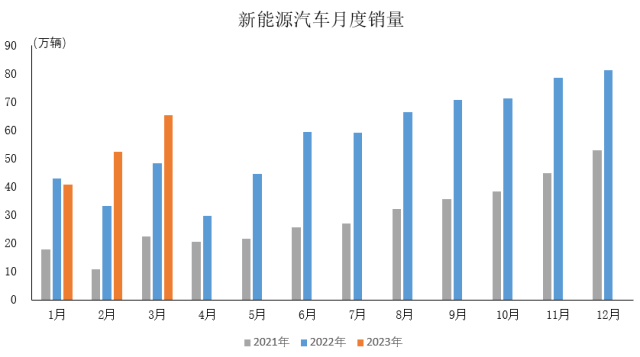 2023年3月,新能源汽車產(chan) 銷分別完成67.4萬(wan) 輛和65.3萬(wan) 輛,環比分別增長22%和24.4%,同比分別增長44.8%和34.8%。