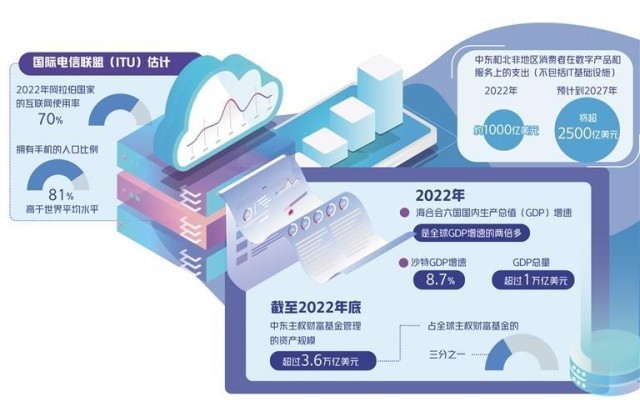 其次,中東(dong) 消費者對互聯網、大數據、金融科技、新能源等高科技產(chan) 品和服務有著旺盛需求,而且有較高的收入水平和支付能力。據國際電信聯盟(ITU)估計,2022年阿拉伯國家的互聯網使用率達70%,擁有手機的人口比例為(wei) 81%,高於(yu) 世界平均水平(73%)。據估計,2022年,中東(dong) 和北非地區消費者在數字產(chan) 品和服務上的支出(不包括IT基礎設施)約為(wei) 1000億(yi) 美元,預計到2027年將超過2500億(yi) 美元。