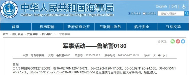 據中國海事局網站消息,青島海事局發布航行警告,4月18日9時至12時,黃海部分海域進行重大軍(jun) 事活動,禁止駛入。