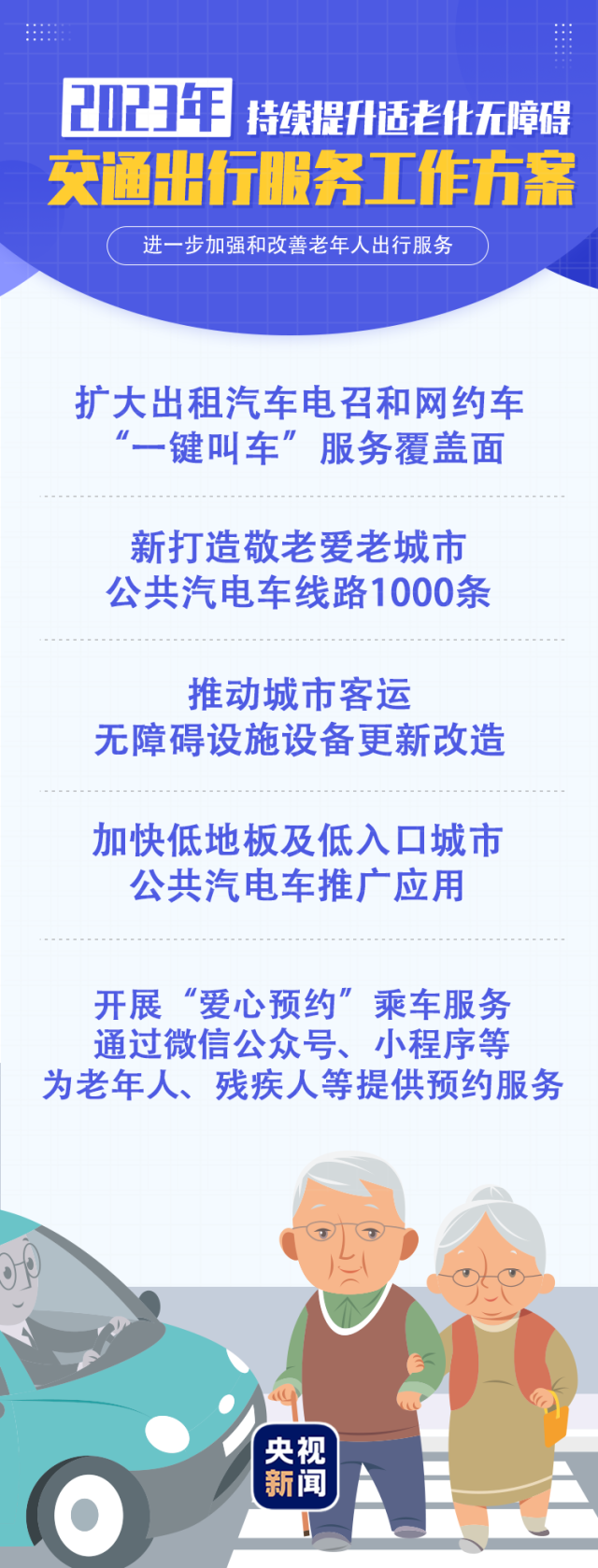 《2023年持續提升適老化無障礙交通出行服務工作方案》提出多項目標任務,滿足廣大老年人無障礙出行服務需要。