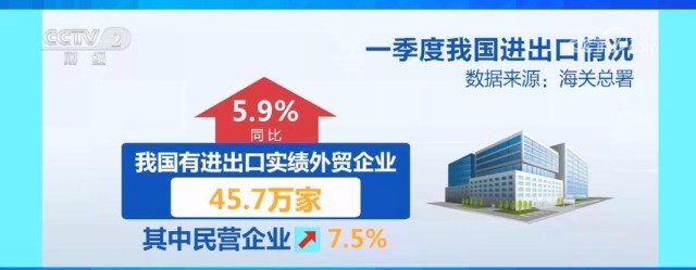 一季度,我國貨物進出口總額98877億(yi) 元。其中,出口56484億(yi) 元,同比增長8.4%,保持了較快增長,特別是我國對“一帶一路”沿線國家進出口增長16.8%,對RCEP其他成員國的進出口增長7.3%。同時,我國外貿競爭(zheng) 新優(you) 勢、增長新動能不斷培育壯大。一季度電動載人汽車、鋰電池、太陽能電池出口同比分別增長122.3%、94.3%和23.6%,合計增長66.9%,同比增量超過1000億(yi) 元,拉高了出口整體(ti) 增速2個(ge) 百分點。此外,一季度,我國有進出口實績外貿企業(ye) 45.7萬(wan) 家,同比增長5.9%。其中,民營企業(ye) 增加7.5%,外貿經營主體(ti) 數量穩中有增,顯示外貿“熱度”穩步提升。