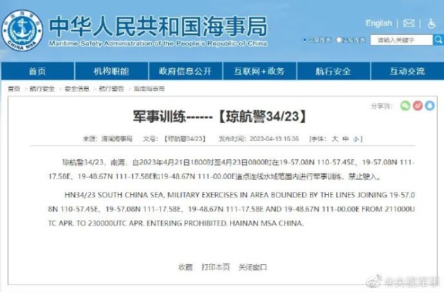 據中國海事局網站消息,清瀾海事局發布航行警告,自4月21日18時至4月23日8時,南海部分海域進行軍(jun) 事訓練,禁止駛入。