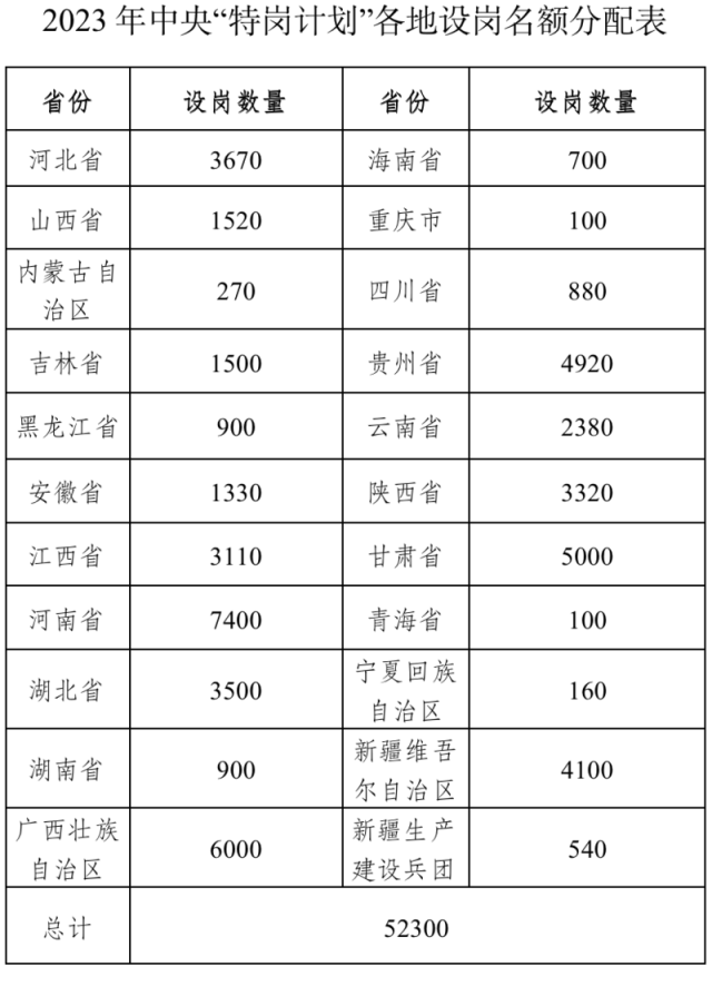 中國青年報客戶端北京4月25日電(中青報·中青網記者 樊未晨)記者今天從(cong) 教育部獲悉,教育部辦公廳、財政部辦公廳近日聯合印發《關(guan) 於(yu) 做好2023年農(nong) 村義(yi) 務教育階段學校教師特設崗位計劃實施工作的通知》,全國計劃招聘特崗教師52300名。