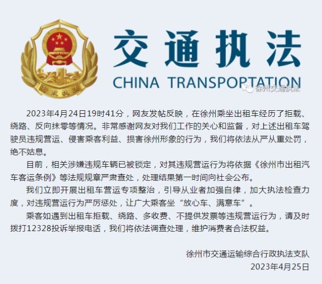 中新網4月25日電 據徐州市交通運輸綜合行政執法支隊微信公眾(zhong) 號消息,2023年4月24日19時41分,網友發帖反映,在徐州乘坐出租車經曆了拒載、繞路、反向抹零等情況。