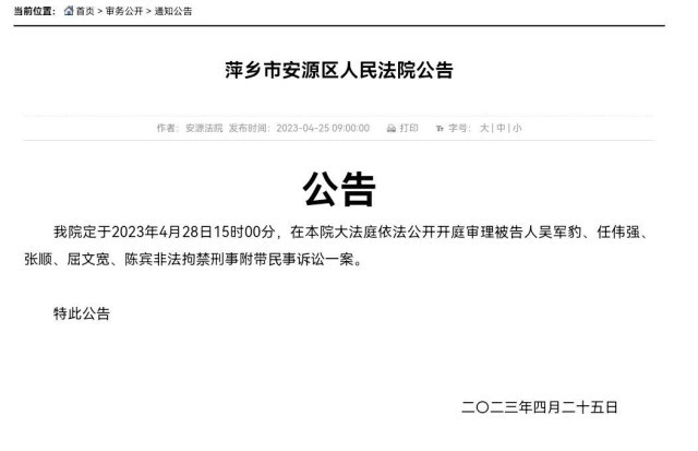 記者今天(25日)獲悉,備受關(guan) 注的江西南昌豫章書(shu) 院非法拘禁刑事附帶民事訴訟一案將於(yu) 4月28日15時在江西省萍鄉(xiang) 市安源區人民法院繼續開庭審理。