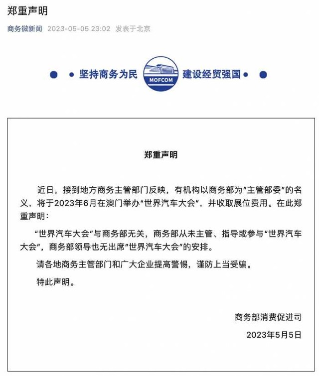 商務部聲明:從未主管、指導或參與“世界汽車大會”
