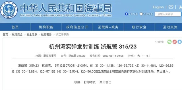 據中國海事局網站消息,浙江海事局發布航行警告,5月12日7時至21時,杭州灣部分水域進行實彈發射訓練活動,禁止駛入。
