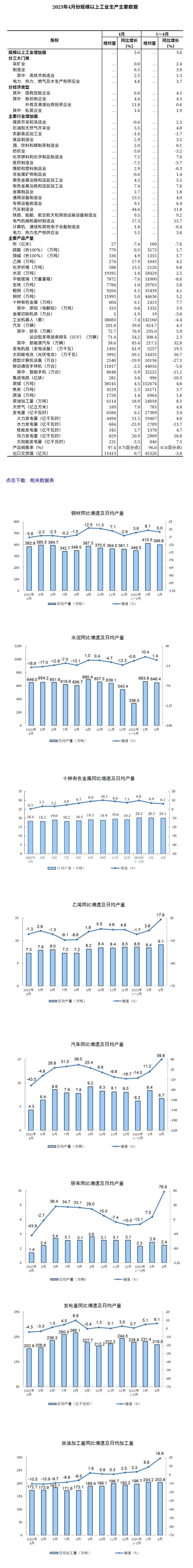 分產(chan) 品看,4月份,620種產(chan) 品中有358種產(chan) 品產(chan) 量同比增長。其中,鋼材11995萬(wan) 噸,同比增長5.0%;水泥19392萬(wan) 噸,增長1.4%;十種有色金屬604萬(wan) 噸,增長6.1%;乙烯274萬(wan) 噸,增長17.9%;汽車201.8萬(wan) 輛,增長59.8%,其中新能源汽車58.6萬(wan) 輛,增長85.4%;發電量6584億(yi) 千瓦時,同比增長6.1%;原油加工量6114萬(wan) 噸,同比增長18.9%。