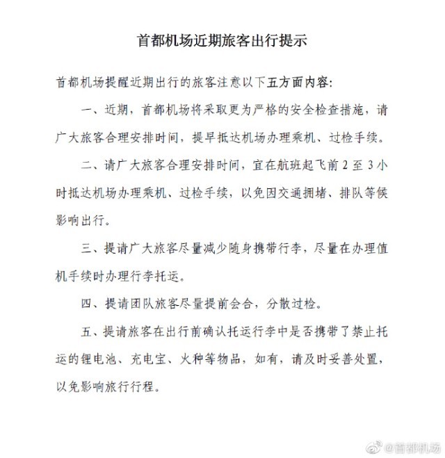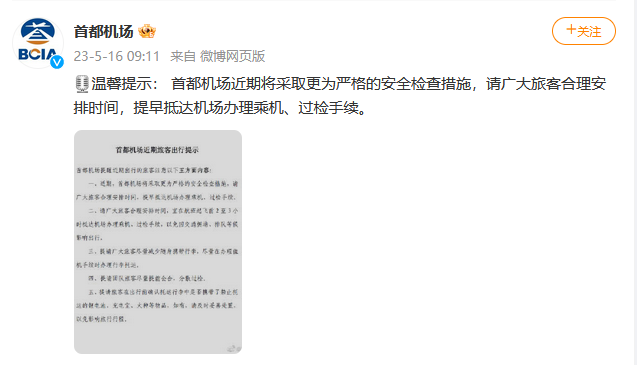 央視網消息:5月16日,@首都機場 官方微博發布提示:首都機場近期將采取更為(wei) 嚴(yan) 格的安全檢查措施,請廣大旅客合理安排時間,提早抵達機場辦理乘機、過檢手續。