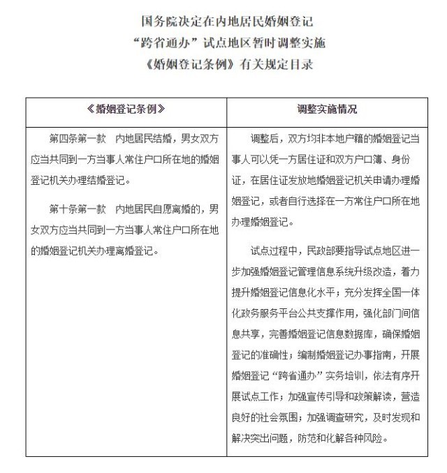 在試點地區,相應暫時調整實施《婚姻登記條例》第四條第一款、第十條第一款的有關(guan) 規定(目錄附後)。調整後,雙方均非本地戶籍的婚姻登記當事人可以憑一方居住證和雙方戶口簿、身份證,在居住證發放地婚姻登記機關(guan) 申請辦理婚姻登記,或者自行選擇在一方常住戶口所在地辦理婚姻登記。