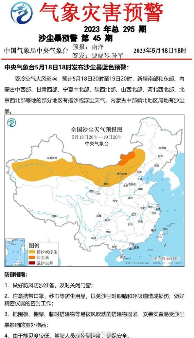 央視網消息:中央氣象台5月18日18時發布沙塵暴藍色預警,受冷空氣大風影響,預計5月18日20時至19日20時,新疆南部和東(dong) 部、內(nei) 蒙古中西部、甘肅西部、寧夏中北部、陝西北部、山西北部、河北西北部、北京西北部等地的部分地區有揚沙或浮塵天氣,內(nei) 蒙古中部偏北地區局地有沙塵暴。