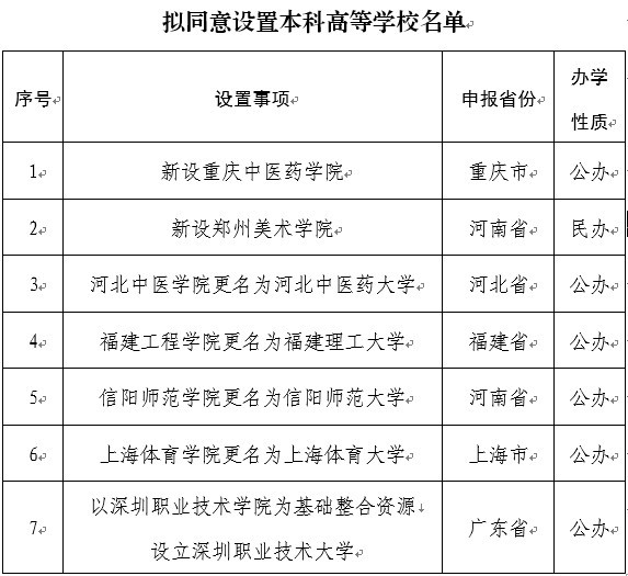 央視網消息:據教育部,根據《中華人民共和國高等教育法》《普通高等學校設置暫行條例》《普通本科學校設置暫行規定》《本科層次職業(ye) 學校設置標準(試行)》等法律法規和規定,經第八屆全國高等學校設置評議委員會(hui) 專(zhuan) 家考察評議,教育部黨(dang) 組會(hui) 議審議,擬同意設置重慶中醫藥學院等7所學校,現予公示。
