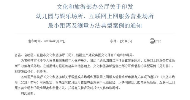 央視網消息:近日,文化和旅遊部辦公廳發布《關(guan) 於(yu) 印發幼兒(er) 園與(yu) 娛樂(le) 場所、互聯網上網服務營業(ye) 場所最小距離及測量方法典型案例的通知》。主要內(nei) 容如下: