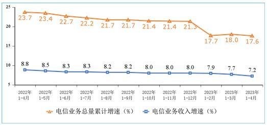 工信部:2023年1—4月份電信業務收入同比增長7.2%