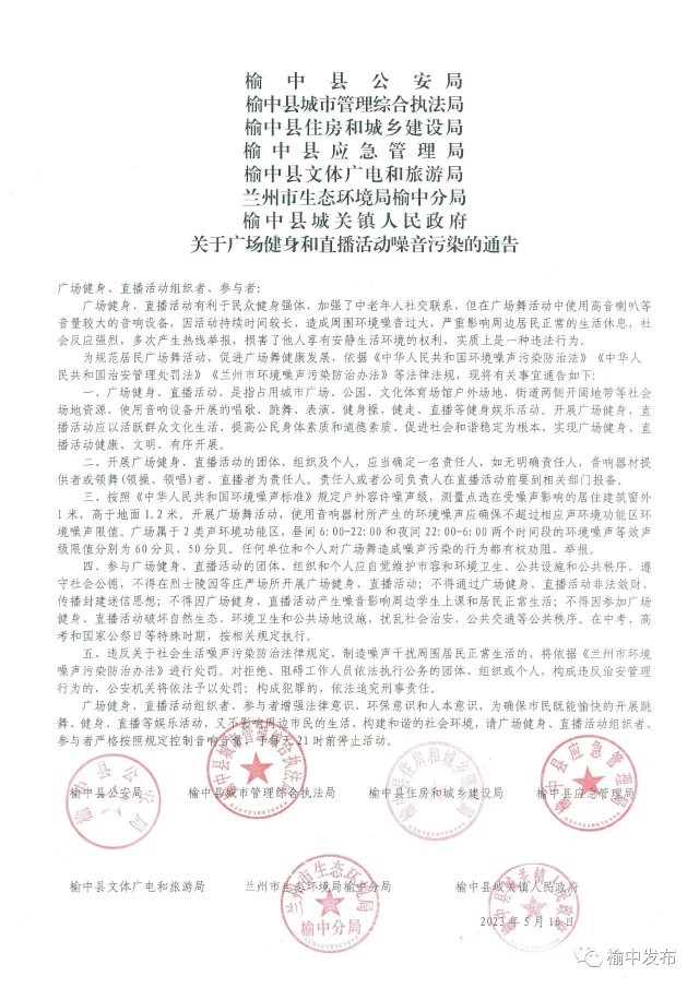 日前,蘭(lan) 州市榆中縣公安局、榆中縣城市管理綜合執法局等單位聯合發布《關(guan) 於(yu) 廣場健身和直播活動噪音汙染的通告》(以下簡稱《通告》),其中明確,當地廣場健身、直播活動組織者參與(yu) 者嚴(yan) 格按照規定控製音響音量,於(yu) 每天21時前停止活動。