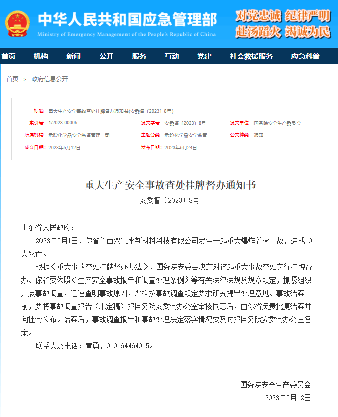 2023年5月1日,你省魯西雙氧水新材料科技有限公司發生一起重大爆炸著火事故,造成10人死亡。