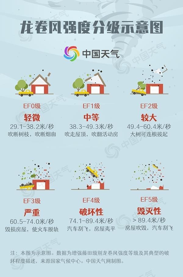 龍卷風生成和消失都迅速,常與(yu) 雷暴、冰雹和暴雨等強對流天氣係統相伴出現,破壞力極強。按藤田級數,龍卷強度分為(wei) EF0級至EF5級6個(ge) 等級,EF0級別最低,EF5為(wei) 最高級別。