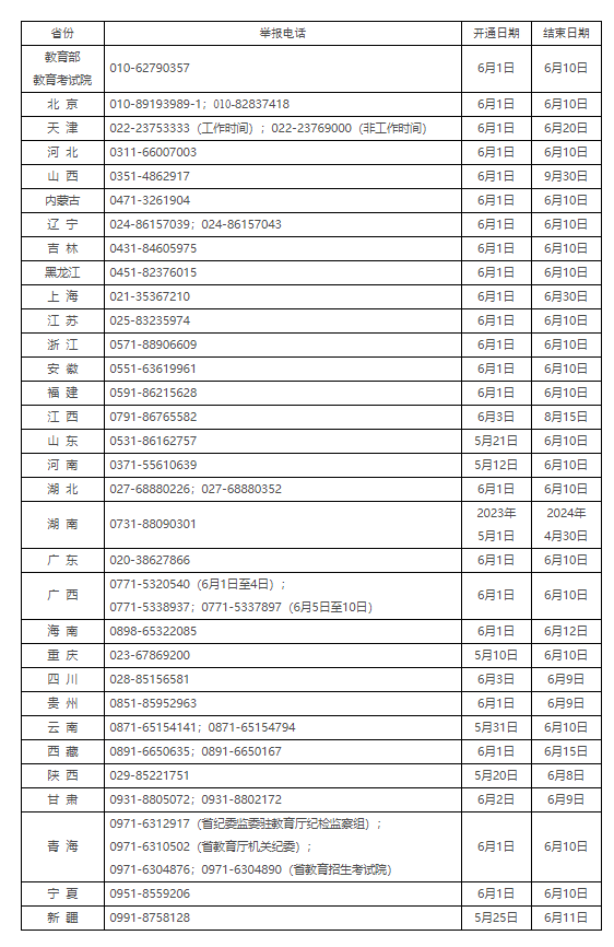 近日,教育部統一公布了教育部以及各省(區、市)2023年的高考舉(ju) 報電話,歡迎廣大考生、家長及社會(hui) 各界人士及時舉(ju) 報反映涉及2023年高考的問題線索。教育部及各省(區、市)將會(hui) 同有關(guan) 部門根據舉(ju) 報線索第一時間核查處理,堅決(jue) 維護高考公平公正。