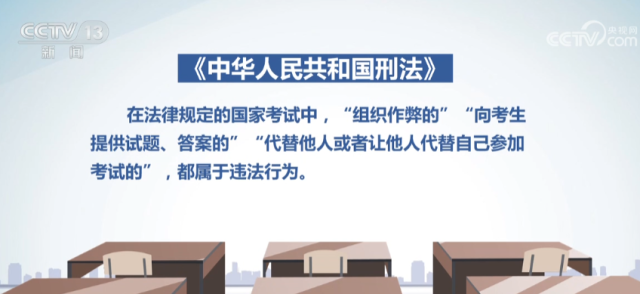 《中華人民共和國刑法》規定,在法律規定的國家考試中“組織作弊的”“向考生提供試題、答案的”“代替他人或者讓他人代替自己參加考試的”,都屬於(yu) 違法行為(wei) 。《最高人民法院、最高人民檢察院關(guan) 於(yu) 辦理組織考試作弊等刑事案件適用法律若幹問題的解釋》明確,對在高考等國家教育考試中組織作弊的,將直接認定為(wei) “情節嚴(yan) 重”行為(wei) ,處三年以上七年以下有期徒刑並處罰金。
