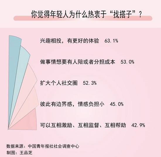 近日,中國青年報社社會(hui) 調查中心聯合問卷網(wenjuan.com),對1335名受訪者進行的一項調查顯示,63.1%的受訪青年認為(wei) 找“搭子”是因為(wei) 興(xing) 趣相投,有更好的體(ti) 驗,53.0%的青年覺得是因為(wei) 做事情想要有人陪或者分擔成本。