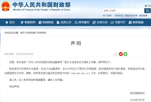 央視網消息:6月6日,財政部網站發布聲明,近期,有偽(wei) 造的“中華人民共和國財政部金融債(zhai) 券”圖片及信息在社交媒體(ti) 上傳(chuan) 播。現聲明如下: