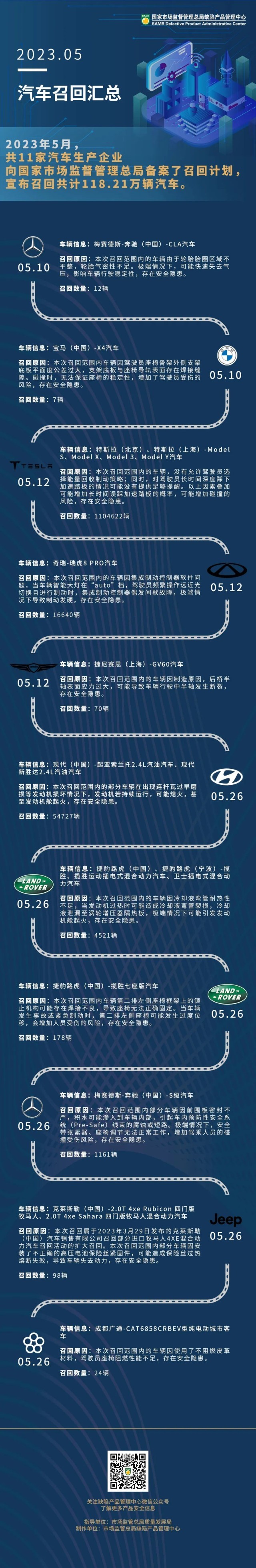 據“市說新語”微信公眾(zhong) 號6月7日消息,2023年5月共11家汽車生產(chan) 企業(ye) 向市場監管總局備案了召回計劃,宣布號回共計118.21萬(wan) 輛汽車。