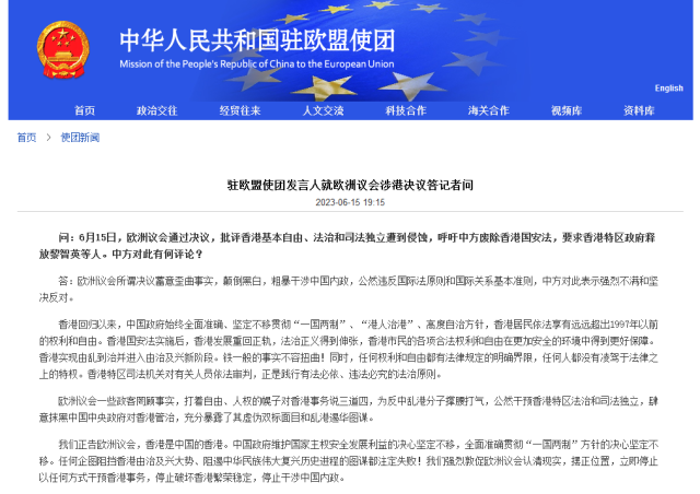 問:6月15日,歐洲議會(hui) 通過決(jue) 議,批評香港基本自由、法治和司法獨立遭到侵蝕,呼籲中方廢除香港國安法,要求香港特區政府釋放黎智英等人。中方對此有何評論?