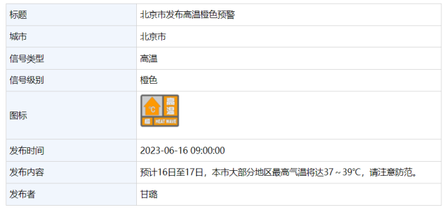 北京市氣象台今天(16日)9時升級發布高溫橙色預警信號:預計16日至17日,北京市大部分地區最高氣溫將達37~39℃,請注意防範。